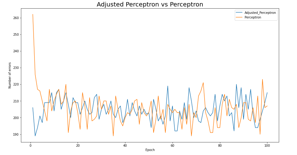 I predicted the train set with the Adjusted Perceptron and drew a graph to see the difference between Perceptron and Perceptron and Perceptron.