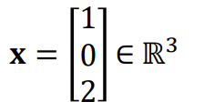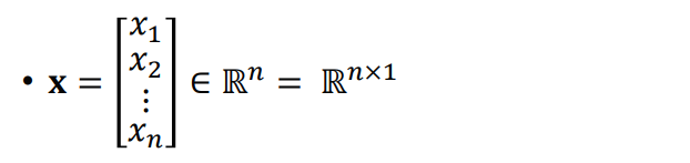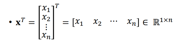 위에 있는 식과 같이 column vector만 존재하는 경우 n개의 rows와 1개의 column만이 존재하기 때문에 해당 식은 R의 N x 1로 표현합니다. 반면 아래와 같이 T라는 기호가 붙게되면 column vector를 row vector로 모양이 바뀌게 됩니다. 그러면 1개의 row와 n개의 columns가 존재하게 되니 이는 1 x N으로 표현할 수 있겠죠.