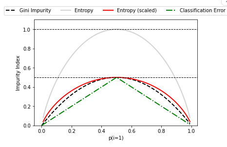 Genie impurity can be understood as a criterion for minimizing the probability of misclassification. Like entropy, classes are maximized when they are perfectly mixed. When P(i=1|t) = 0.5 and P(i=0|t) = 0.5, Gini impurity has a value of 0.5.