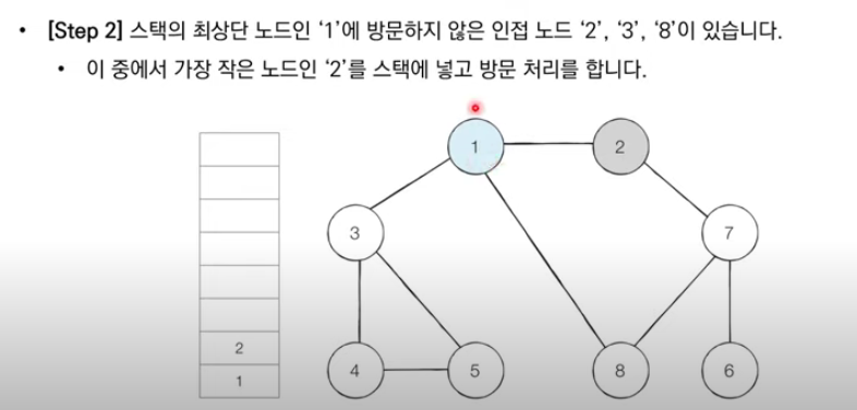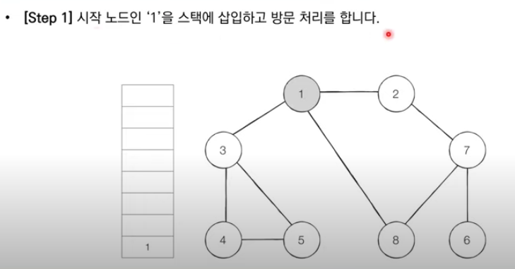 1. 탐색 시작 노드를 스택에 삽입하고 방문 처리를 한다.