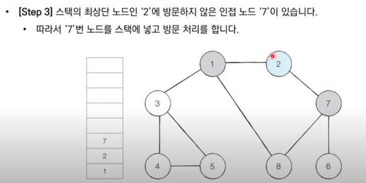 # 현재 노드와 연결된 다른 노드를 재귀적으로 방문하여 스택에 쌓는 듯이 동작하도록 한다.