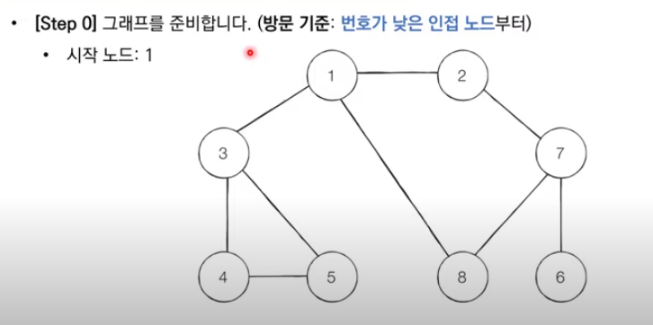 0. 그래프를 준비한다. (해당 강의에서는 번호가 낮은 인접 노드 순으로 방문하는 기준을 세움)
