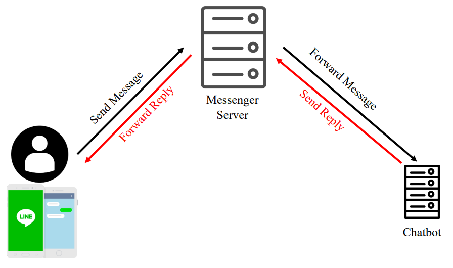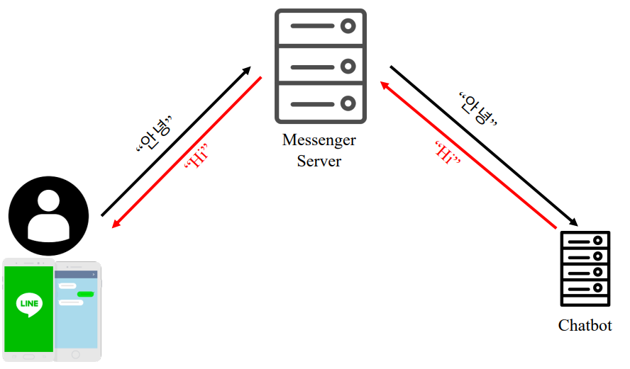 - 사용자가 우선 메세지를 서버에게 보낸다. 이를 서버는 챗봇에게 보내주고, 이에 맞는 액션을 취해주고 그 결과를 서버를 통해 사용자에게 메세지를 전달해준다.