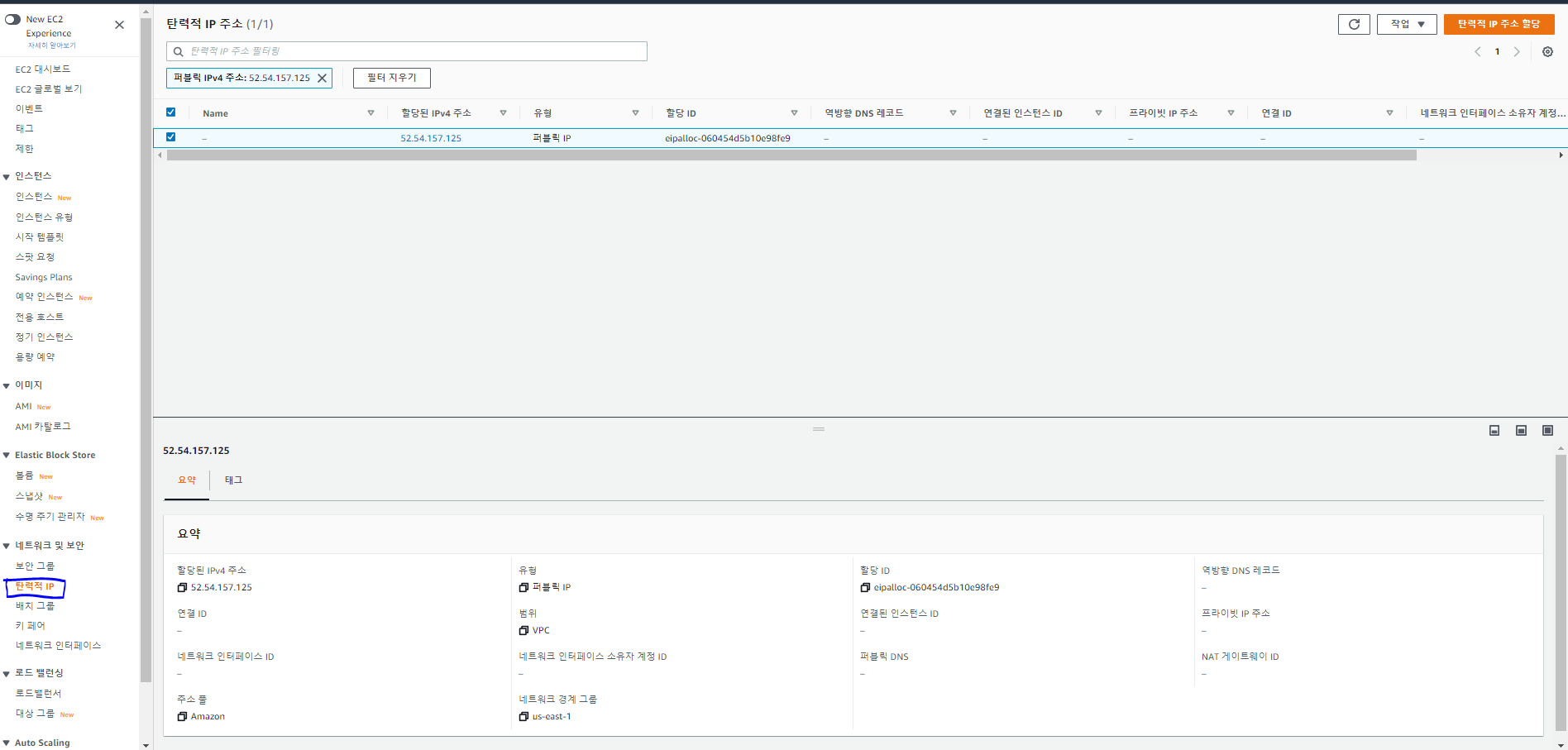 - 기본설정의 IP를 사용하게되면 매번 실행시킬 때마다 IP 주소가 달라지기 때문에 '탄력적 IP'를 활성화 해야한다.