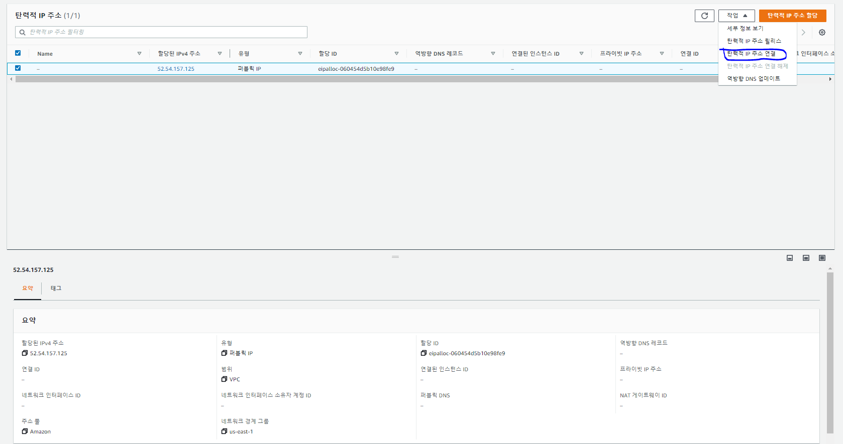 - 이후 설정한 주소와 탄력적 IP 주소 연결을 통해 인스턴스와 IP 주소를 연결해주면 된다.