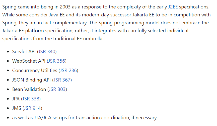다시 돌아와서 스프링은 Jakarta EE 플랫폼 사양을 받아들이지는 않았지만 Java EE에서의 선별된 몇몇 기능을 사용하는 것 같다. 아까 예시로 들었던 서블릿이나 웹 소켓 등이 이에 해당하는 기술인 듯하다.