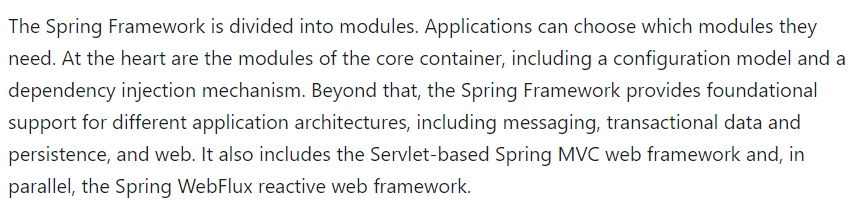 스프링 프레임워크는 여러 모듈로 나눠진다. 각 애플리케이션은 필요한 모듈을 선택할 수 있다. 이때 각 모듈의 중심에는 'Configuration model'과 'dependency injection mechanism'이 있다고 한다.