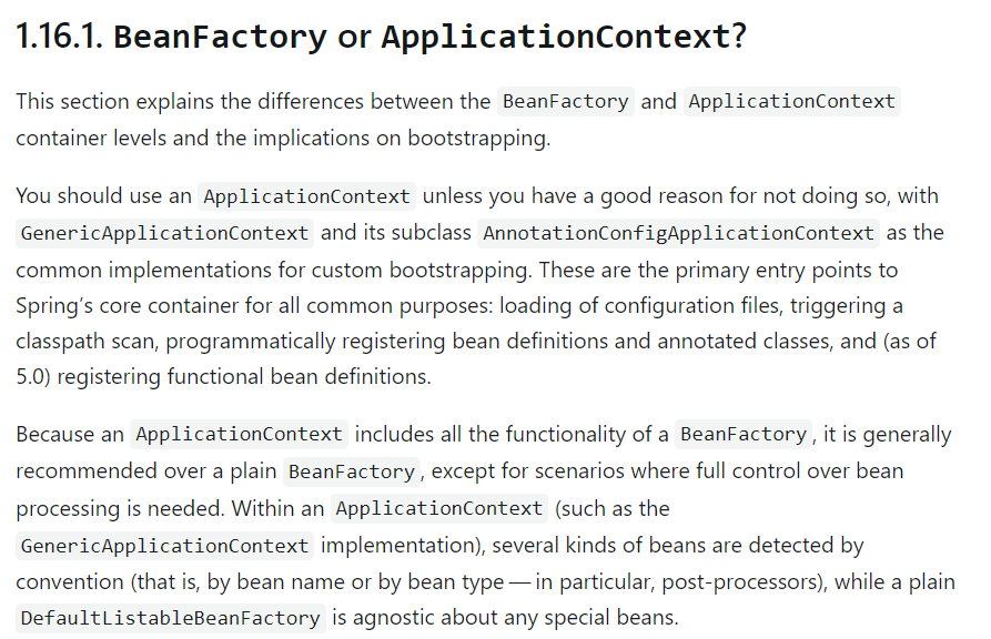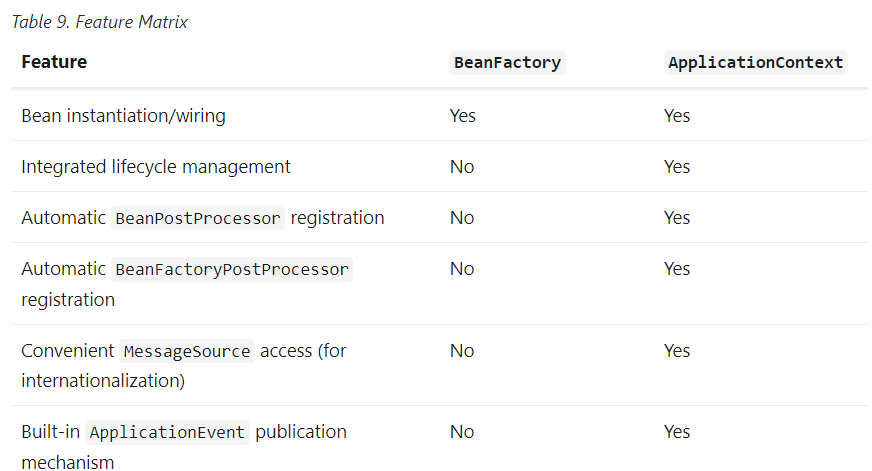 공식 문서에서는 이를 조금 더 자세히 비교해가면서 이야기하고 있다. 결론부터 말하자면 특수한 상황이 아닌 경우에는 ApplicationContext를 사용하는 것이 좋다고 한다.