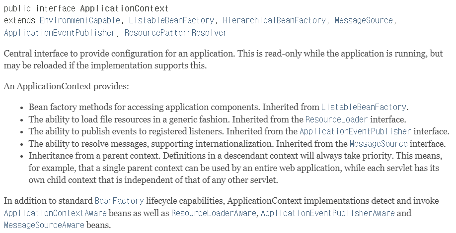 ApplicationContext는 각 구성요소(Bean)에 접근하기 위해 BeanFactory를 상속받았다고 이야기하고 있다.