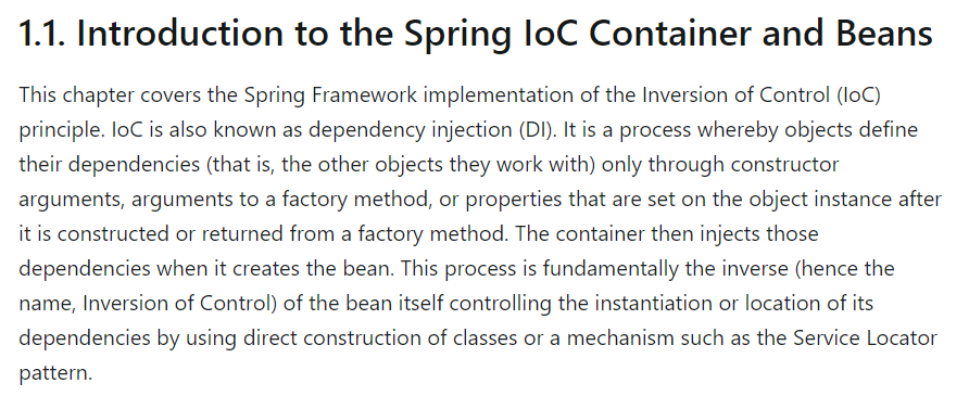 스프링에서는 이와 같은 IoC를 위해 DI(의존성 주입)를 사용한다. 의존성 주입을 사용함에 따라서 비즈니스 도메인의 의존성을 외부로부터 주입받게 된다. 이때 외부에서 의존성을 주입해주는 주체가 바로 IoC Container가 된다.