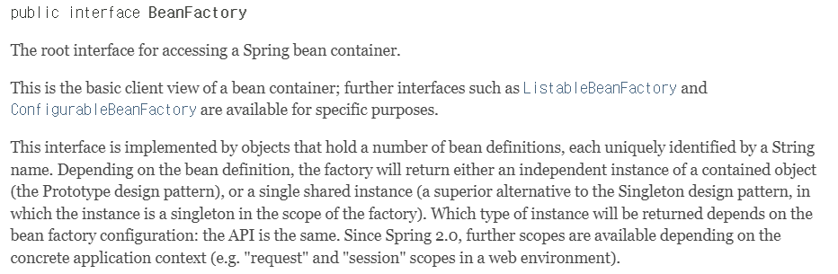 BeanFactory라는 인터페이스는 위에서 설명한 IoC Container의 역할을 한다. 이를 자세하게 설명하기 위해선 Bean이라는 개념에 대해서 이해하고 있어야하는데, Bean이란 간단하게 말해서 Spring에서 IoC Container가 관리하는 대상 객체를 의미한다고 생각하면 된다. 이전에 포스팅에서 @Component라는 어노테이션에 대해 설명했는데, @Component 어노테이션을 사용하면 해당 클래스 객체가 빈으로 등록이 된다. 이렇게 빈으로 등록되면 나중에 의존성 주입의 대상이 될 수 있다. 뭐... 싱글톤 빈이니 프로토타입 빈이니, 빈에 대한 각종 유형이 있지만 지금은 ApplicationContext를 정리하고 있으니 이에 대해선 나중에 따로 글을 포스팅하도록 하겠다.