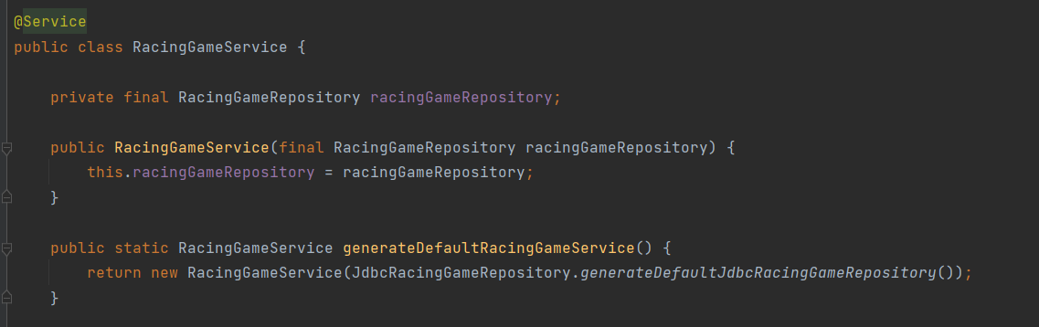 말 그대로 어노테이션을 사용해서 bean을 정의하는 방법이다. 빈으로 등록할 클래스의 이름 위에는 @Component 어노테이션을 붙이고, 의존성 주입을 할 대상에는 @Autowired 어노테이션을 붙여서 사용하면 된다. 개인적으로 이번 웹 자동차 경주를 구현하면서 빈을 등록하기 위해서 사용한 방법이었다.