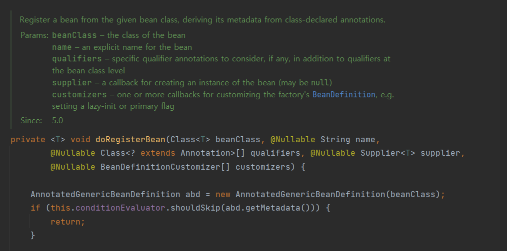 쭉쭉 들어가다보면 bean을 직접 등록하는 메서드도 등장한다.