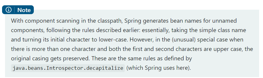 Component scan을 사용해서 bean을 등록하는 경우에는 Spring에서 정해놓은 규칙에 따라 bean의 이름을 생성한다. 기본적으로는 클래스의 이름을 가져온 뒤 첫 글자를 소문자의 형태로 바꾼다.