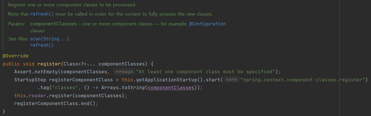 이때 register 메서드가 호출되는 것을 볼 수 있는데, 이는 component class를 등록해주는 과정을 거치게 된다.