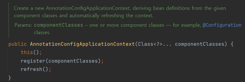 마지막으로 ComponentScan과 관련된 주의사항이 하나 있다. @Configuration을 사용해 ApplicationContext에 빈을 등록할 수 있는데, 이때 AnnotationConfigApplicationContext 생성자를 통해 ApplicationContext를 생성할 수 있다.