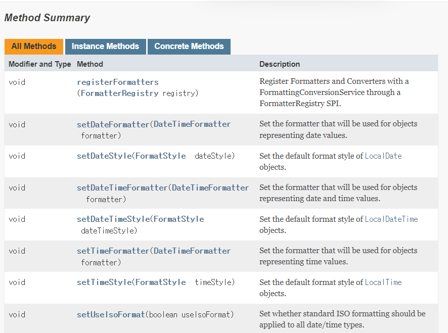 DateTimeFormatterRegistrar은 위와 같은 메서드를 제공한다. 뭐... 설명만 보면 크게 어려운 부분은 없어서 이 정도만 짚고 넘어가도록 하겠다.