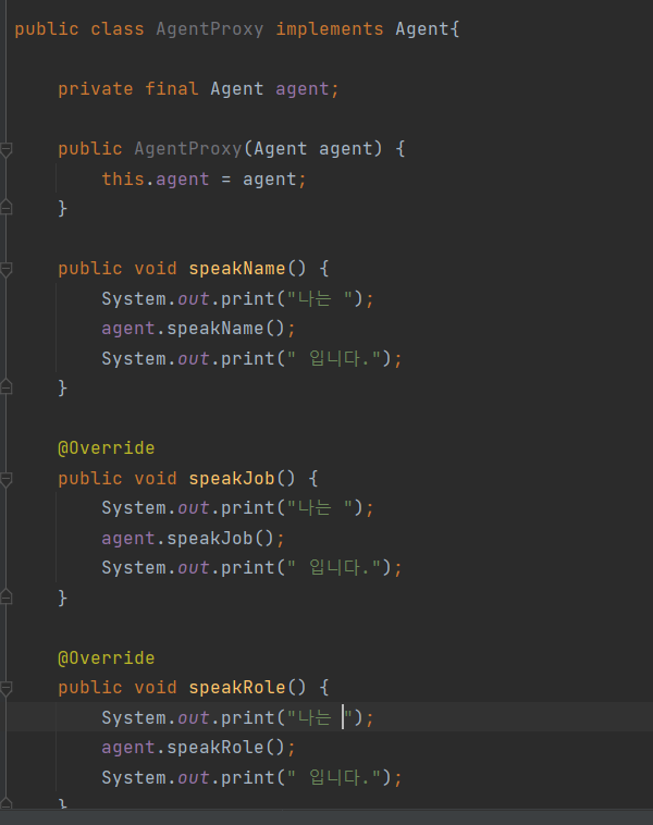 그리고 외부에서는 agent를 사용하는 것이 아니라 agentProxy를 사용할 수 있다. 이렇게 나누게되면 핵심 기능을 agent에 위임하고 그 밖의 부가 기능만 proxy가 처리해주면 된다. 따라서 핵심기능을 담당하는 agent에서는 부가기능을 고려하지 않아도 된다. 그리고 프록시 내부의 필드도 인터페이스이기 때문에 어느 데코레이터에서 어느 타깃으로 연결될지에 대해서는 코드 레벨에서 알 수 없다는 점도 특징이다.