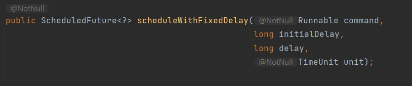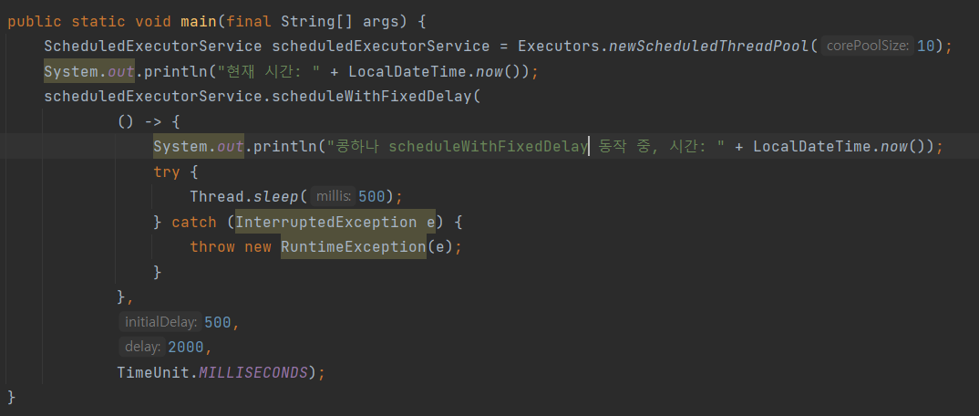 초기 딜레이 시간과 주기를 전달해줄 수 있습니다. 처음 쓰레드를 실행하고 initialDelay 만큼 지난 이후에 동작이 수행됩니다. period는 쓰레드를 실행하는 반복 주기를 의미합니다.