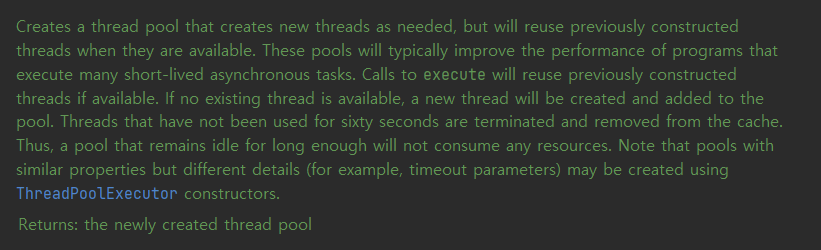즉, 처음 쓰레드 풀을 생성했을 때에는 쓰레드를 가지고 있지 않고, 요청이 들어올 때마다 쓰레드를 하나씩 생성해가며 쓰레드 풀에 가져다 놓는다는 것을 알 수 있는데요. 60초 동안 일하지 않는 쓰레드들은 모두 해제하는 것을 알 수 있습니다.