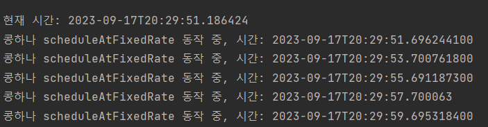 scheduleAtFixedRate()는 정확히 2초 간격으로 메소드가 실행되는 것을 확인할 수 있습니다.