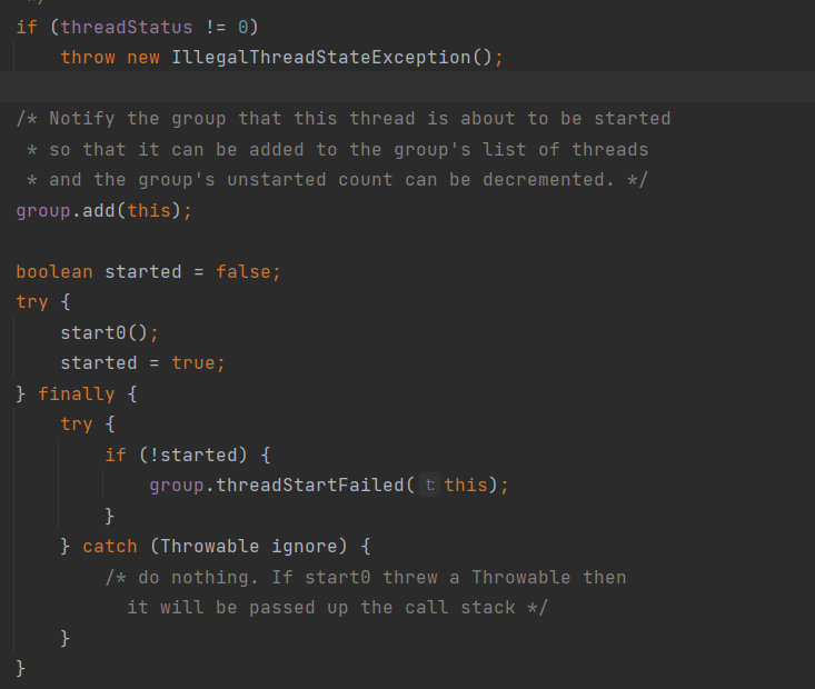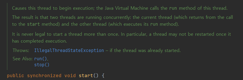 위의 코드는 Thread의 start() 메소드인데요. 내부적으로 보면 start0()이라는 메소드를 호출하고 있습니다.