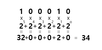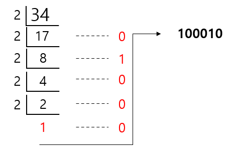 예를 들어 십진수로 표현된 34를 이진수로 표현하고자 한다면, 다음과 같이 계산할 수 있다.