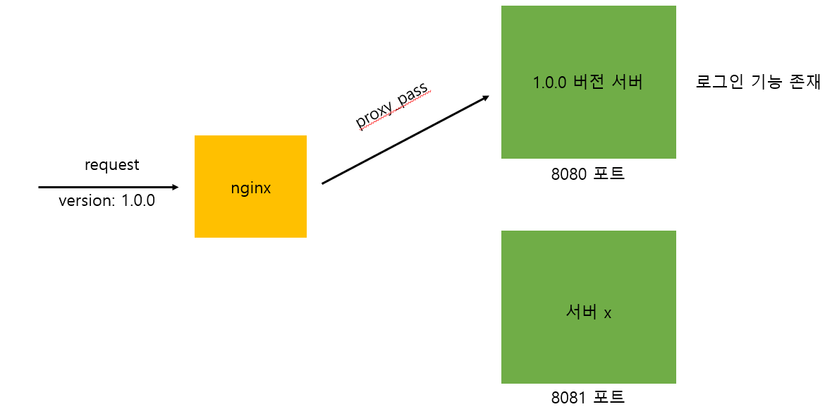 위와 같이 명시를 하게되면 버전 정보를 파싱하여 웹서버를 매핑할 수 있습니다. 버전이 없는 경우에는 일단 1.0.0 버전의 서버로 요청이 전달되도록 했습니다. 이전에 안드로이드 어플을 다운로드받은 사용자는 버전이 없기 때문에 해당 요청들도 모두 받을 수 있게 하기 위해서죠.