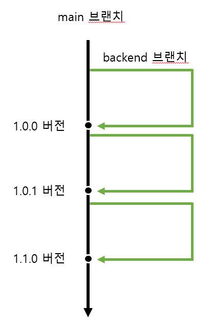 1.0.0 버전에서 1.0.1 버전으로, 1.0.1 버전에서 1.1.0 버전으로 업그레이드가 됩니다. 겉으로 보기에는 큰 문제가 없어보이죠. 버전이 업그레이드되는 것은 자연스러운 현상이니까요. 그러나 1.1.0 버전으로 업그레이드를 한 이후에는 1.0.x 버전에 대한 업그레이드가 불가능합니다. main 브랜치 하나에서만 작업을 하기 때문에 중간에 1.0.1 버전에 대한 브랜치를 따로 만들어서 merge를 시키게 되면 1.1.0 버전과 충돌이 발생할 수 있고 여러 버전이 하나의 브랜치에서 섞여버린다는 문제가 발생합니다.