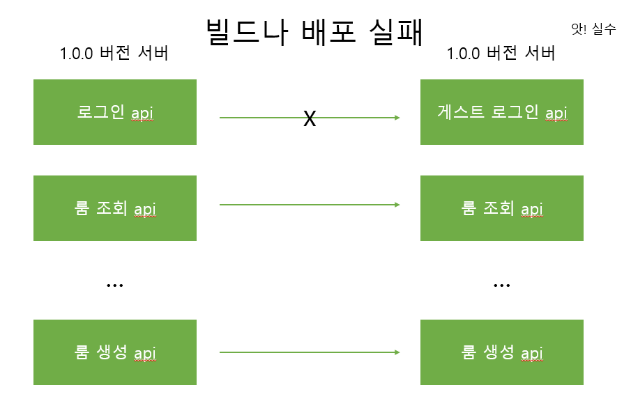 하지만 개발자가 실수로 버전 업그레이드를 하지 않은 채로 배포를 하게되면 1.0.0 버전 서버에 덮어쓰기가 됩니다. 저희 서비스에서 로그인 기능은 사라지게 되는 것이죠. 결국 휴먼 에러가 서비스 전반에도 영향을 미치게 됩니다. 정말 큰 문제인 것이죠. 그래서 서비스 규모가 커지기 전에 이러한 문제를 방지하는 것이 큰 과제라고 생각합니다.