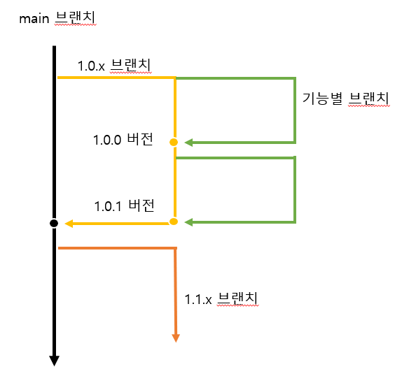 - 업그레이드된 Major 버전이나 Minor 버전을 만들 때는 바로 직전 버전의 브랜치를 main에 merge한 이후에 진행한다. (상황에 따라 main에 merge하는 브랜치가 달라질 수 있음)