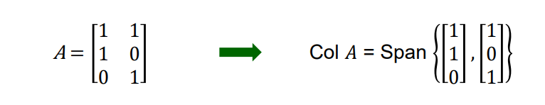 Col A에서 세 번째 column에 있는 vector는 1번째 vector와 2번째 vector를 더해서 만든 vector입니다. 따라서 이는 선형 조합에 닫혀있다는 조건을 만족하지 못합니다. 결국 Col A는 다음과 같은 span을 가지게 됩니다.
